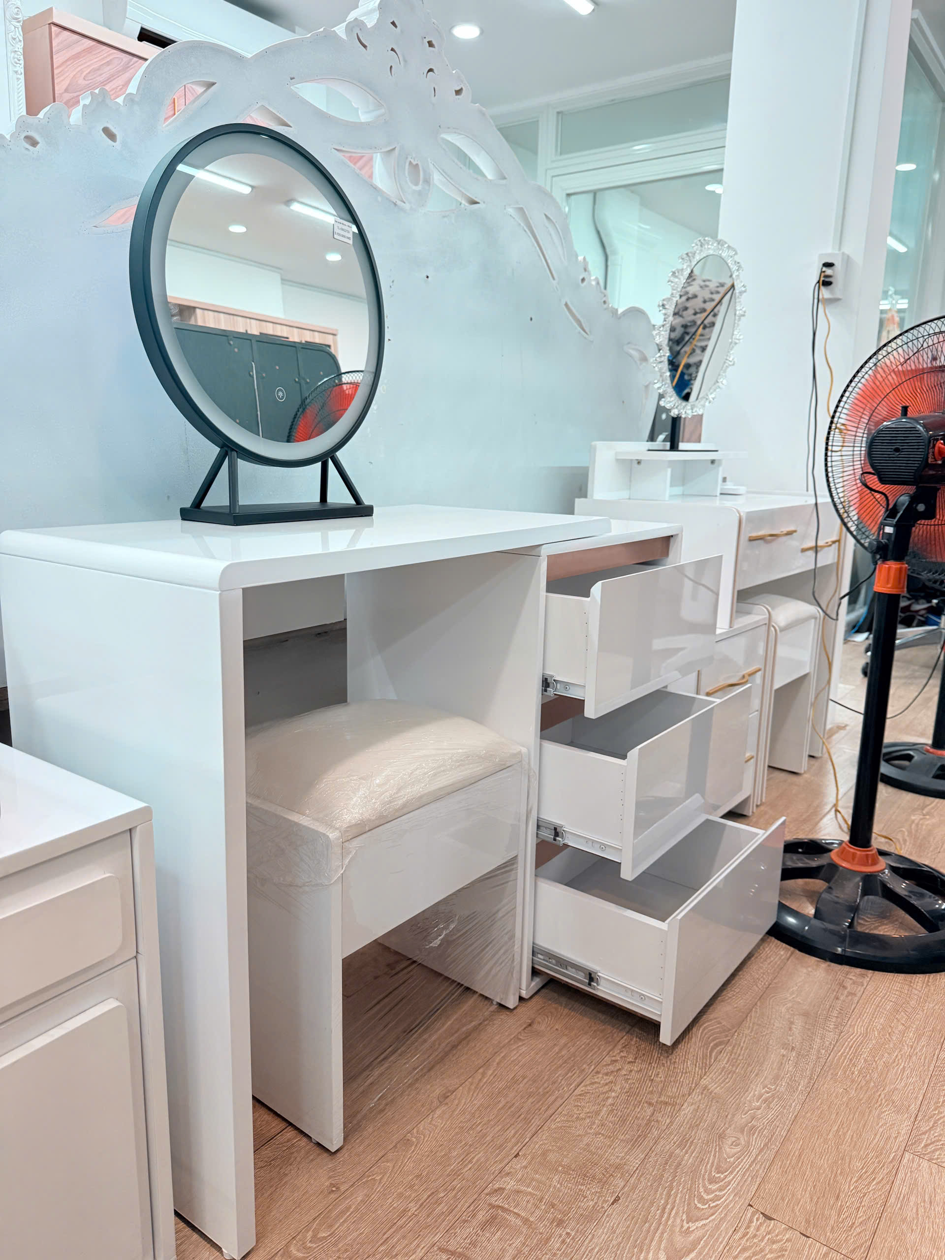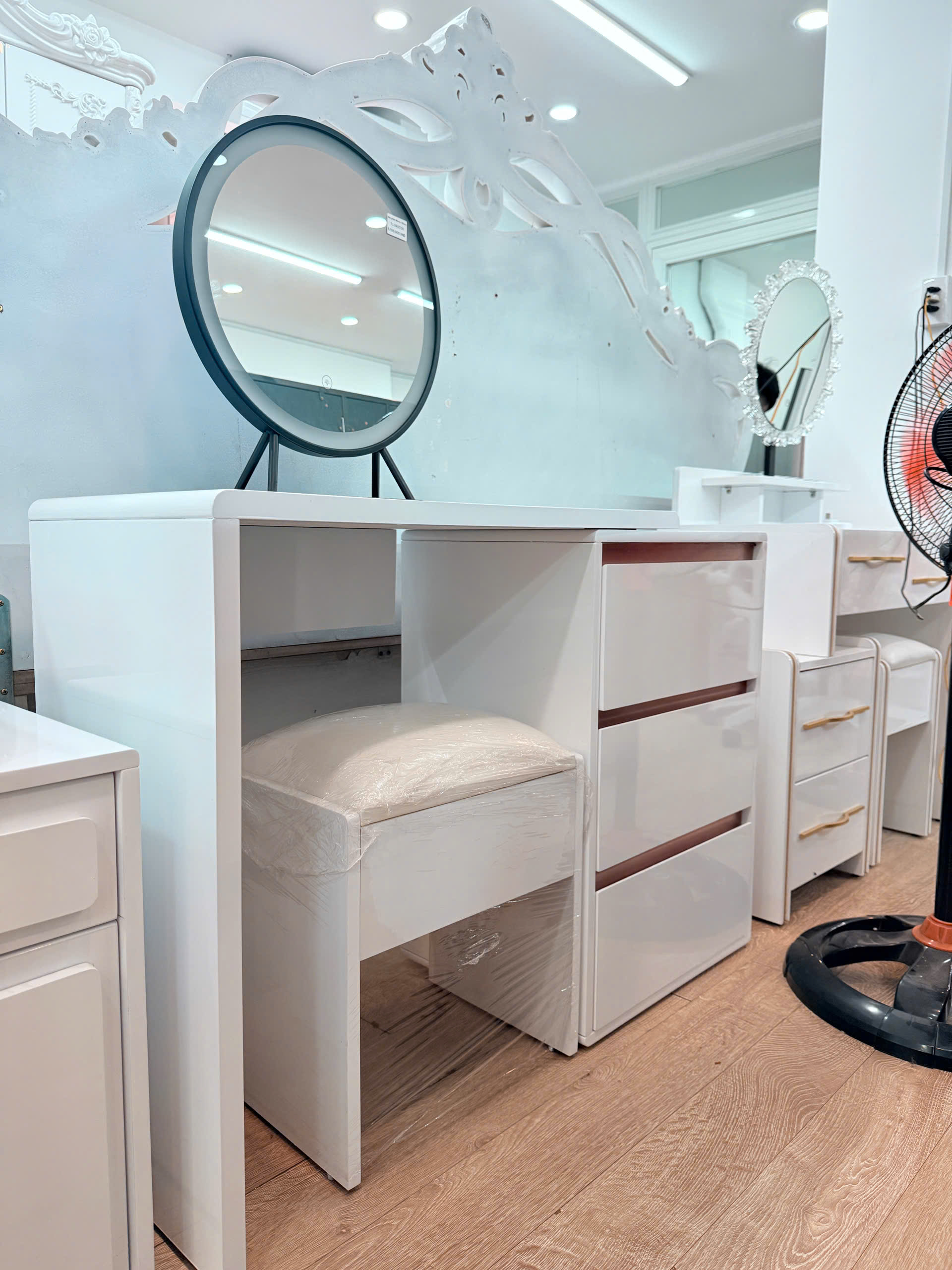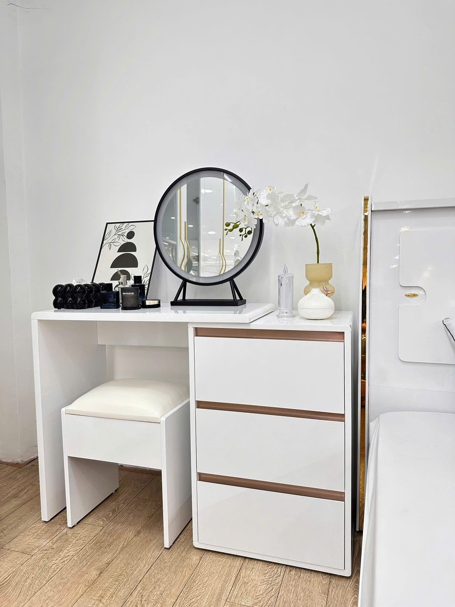 - Chiếc bàn trang điểm không chỉ là nơi lưu giữ những món mỹ phẩm yêu thích, mà còn là điểm nhấn nâng tầm không gian phòng ngủ của bạn. Với gương LED 3 chế độ ánh sáng hiện đại, sản phẩm mang lại trải nghiệm trang điểm tiện nghi, rạng rỡ trong mọi thời điểm trong ngày.