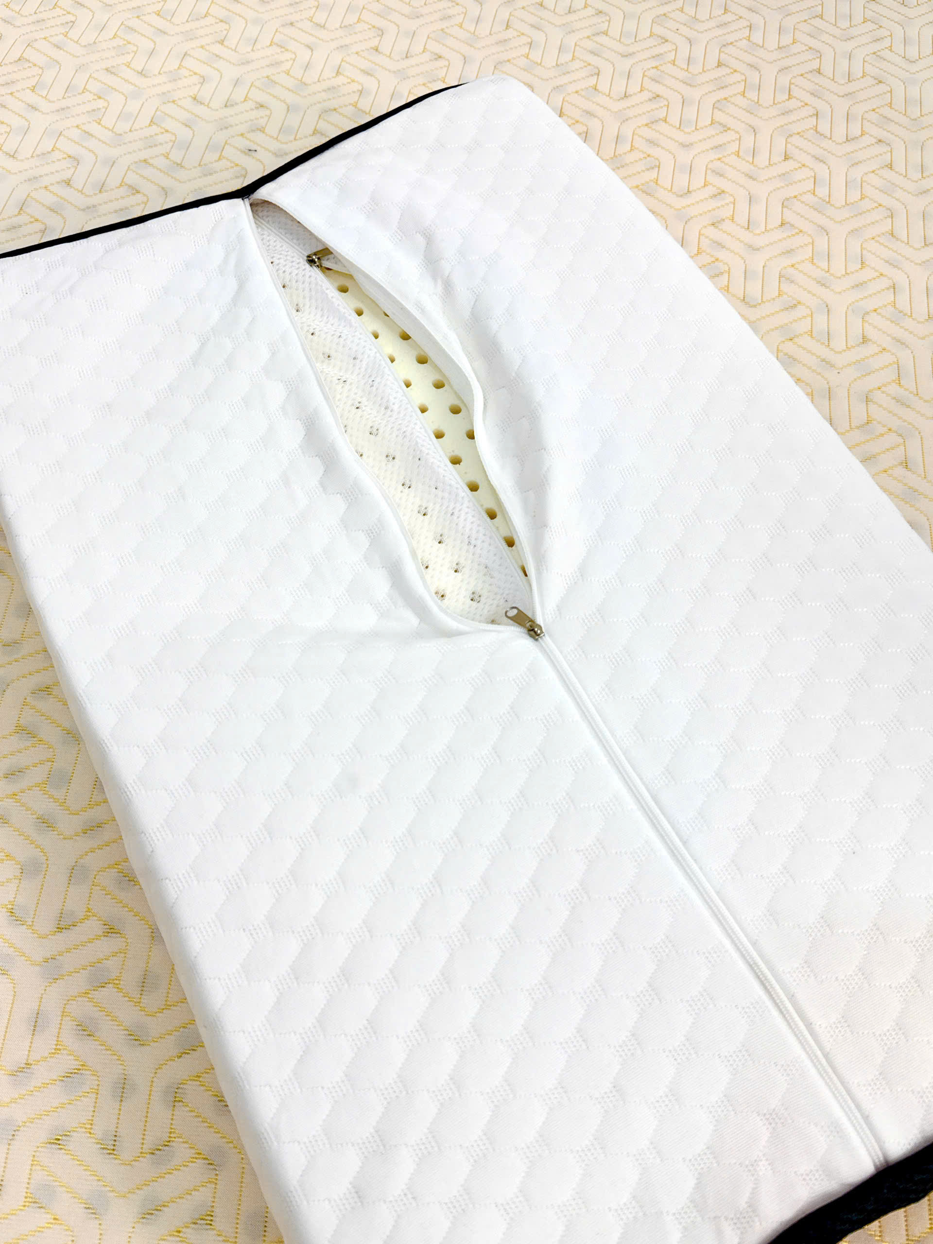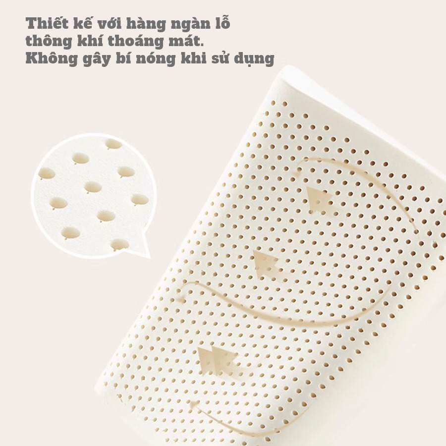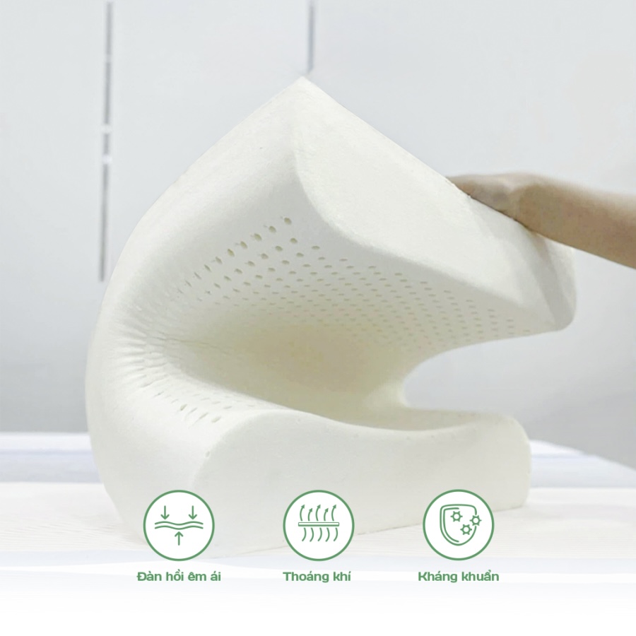 Bề mặt gối được bố trí hệ thống lỗ thông hơi nhỏ li ti, giúp không khí lưu thông liên tục, hạn chế vi khuẩn, tạo cảm giác mát mẻ suốt đêm. Lớp áo bảo vệ bằng thun Jersey mềm mại, thoáng mát, tích hợp dây kéo tiện lợi, dễ dàng tháo rời và vệ sinh.